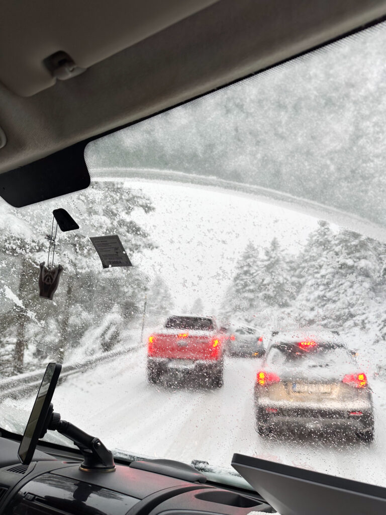 Protože mlha byla hustší a hustší a k tomu se přidávalo silné sněžení. Nakonec jsme to vzdali kousek pod horní stanicí lanovky, sundaly pásy z lyží, sjeli si tu širokou sjezdovku téměř bez lidí se zastávkou na kafe v místním skibaru. Předpověď na další den byla špatná, tak jsme se rozhodli sjet dolů do údolí. To jsme ještě nevěděli co nás při sjezdu čeká. Všichni začali v hojném počtu taky sjíždět dolů, jenomže celý den nepřestalo chumelit, podmínky na silnici nám nepřišli zas tak hrozné, ale připravenost a řidičské schopnosti Řeků na sněhu, jsou ještě o něco horší než většiny Pražáků u nás v Krkonoších, takže naše maximální rychlost dolů byla 5km/h k tomu jsme prostáli dvě hodiny v kolonách s přehlídkou několika aut v „pangejtu“ a nebylo to jiné ani při odbočení z horské silnice.