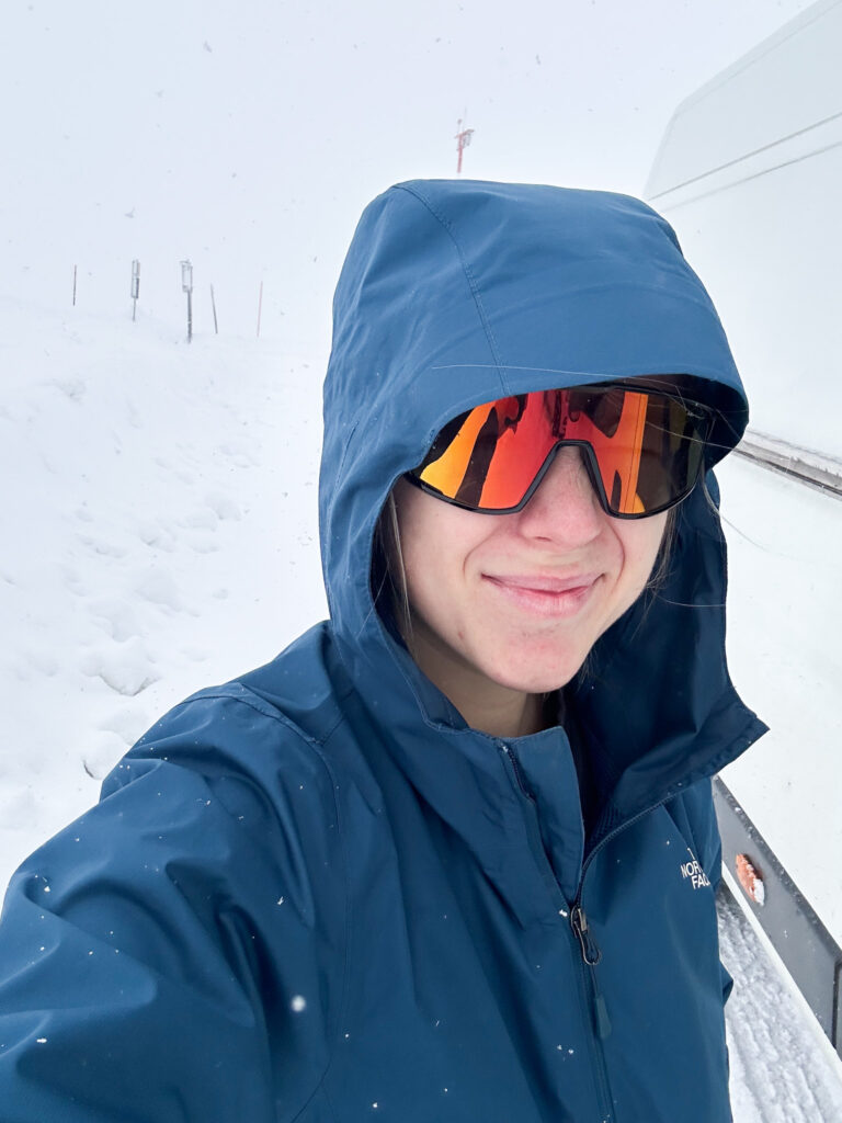 Na parkoviště přijíždíme mezi prvními, pán v oranžové vestě nám ukazuje kam máme zaparkovat. Teplota je kolem nuly a venku stále vydatně sněží, při pohledu na sjezdovku vidíme pouze dva sloupy kabinové lanovky, dál nám už mlha bohužel bere šanci se kochat.