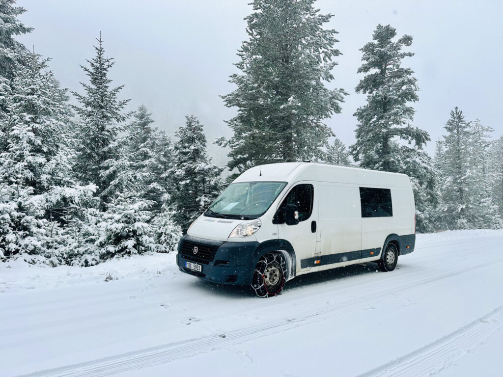 Ten den sněžilo i v nížinách. Po ujetí asi 10 km jsme pro dnešek cestování vzdali, zapíchli to u silnice na parkovišti restaurace, do které jsme si zašli na večeři. Tam se s námi dal do řeči číšník, který nám potvrdil, že místní nejsou zvyklí na sníh na komunikacích a nebývají na to ani připraveni.