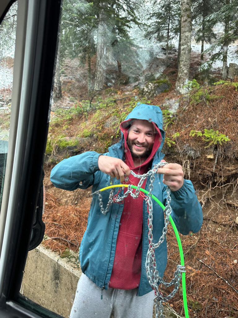 Než se do všeho nasoukáme, skoro prázdné parkoviště, které jsme viděli při příjezdu je už skoro plné a nás zaujali dvě věci. Jedna jsou jejich návleky na kolech, které fungují stejně jako sněhové řetězy, vypadají jak zahříváky co můžete vidět při závodech F1, googlime co to vlastně je a říkáme si, že tohle k nám ještě nedošlo. Vzdělaný o tohle poznání nás zaráží ještě ta druhá věc, málo lidí si nese snowboard, lyže, nebo saně, prostě cokoliv, co patří na sjezdovky. Většina lidí je jen hezky nastrojených v bundě s kožichem za krkem. Na sjezdovce přichází pro nás příjemné zjištění svah je na poměr aut na parkovišti skoro prázdný. Většina těch Řeků se opravdu přijela jen podívat na sníh, vyfotit se s ním, koulovat a stavět sněhuláky. Zkrátka trochu jiný obrázek skiresortu než na který jsme zvyklý. Hned nás opouští obava z toho jestli není blbý jít na skialpech po okraji nahoru. Taky jsme zde asi jediný skialpinisté a nutno podotknout, že jsme se ještě na hory v Řecku několikrát podívali, ale na skialpinistu jsme nenarazili.
